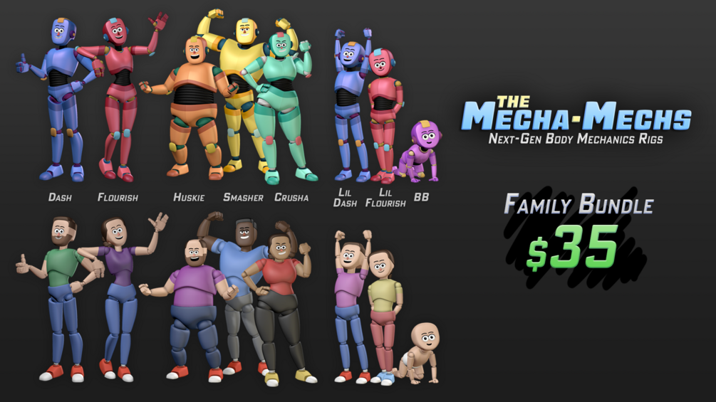 maya rig rigs character expressive josh sobel girl female man male woman proxy body mechanics robots robot droid droids bot mech mecha mechs bones primatives block blocks blocking fat overweight chubby huskie buff strong smasher curvy plus size crusha dash flourish lil bb baby infant toddler