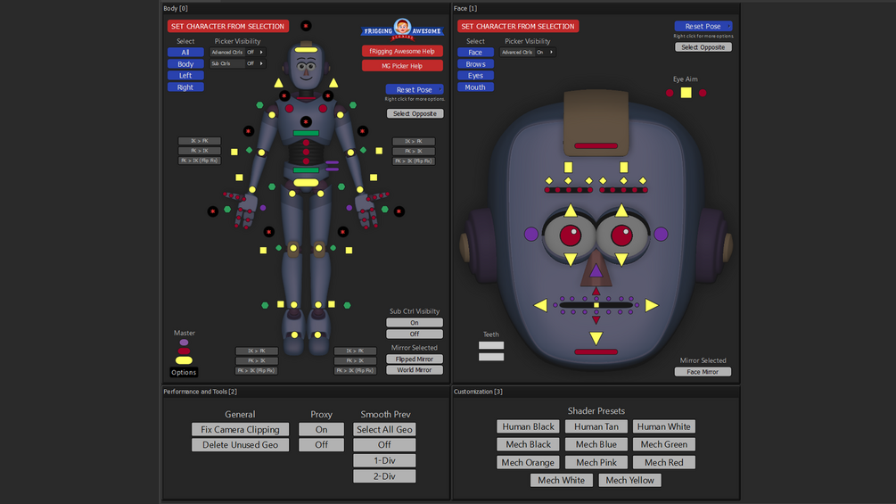 Please Note: Although critical bugs are usually fixed quickly, this product should be considered an "as-is" sale, since fRigging Awesome isn't currently available for full time rig production. Requests for new features or minor bug fixes may not be possible to address. If you are unhappy with your purchase or you encounter compatibility issues with your Maya install, you may request a full refund.